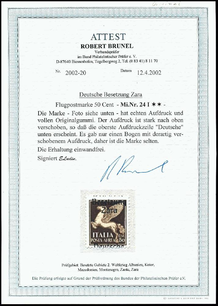 | Zusatzinformationen und Suchstichworte: | Dr. Reinhard Fischer 188. Auktion 1. - 3. September 2022 Los 3560 Deutsche Besetzung II. WK Zara 50 C. Flugpostmarke mit Aufdruckverschiebung "Besetzung/Zara/Deutsche", postfrisch, gepr. Ludin, Fotoattest Brunel BPP, Mi. 1.200,- Zuschlag 300,00 EUR |