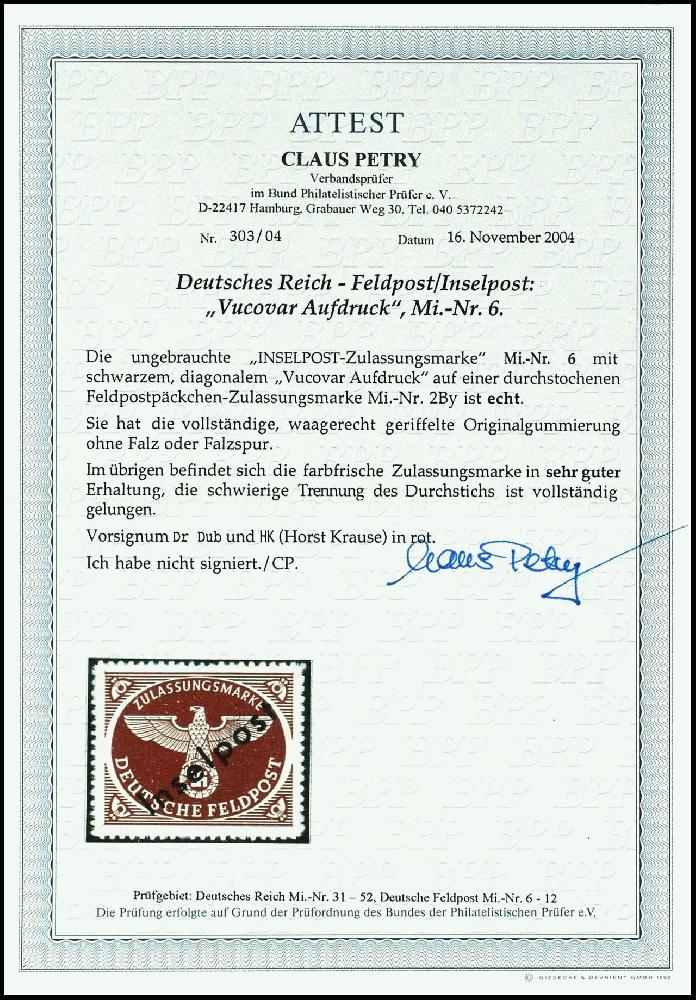 | Zusatzinformationen und Suchstichworte: | Dr. Reinhard Fischer 188. Auktion 1. - 3. September 2022 Los 3577 Deutsche Besetzung II. WK, Feldpostmarken Vucovar Aufdruck, Zulassungsmarke durchstochen, tadellos postfrisch, gepr. Dr. Dub, HK (Horst Krause) und Fotoattest Petry BPP (2004): "in sehr guter Erhaltung..", Mi. 2.400.-, Zuschlag 1.000,00 EUR |
