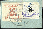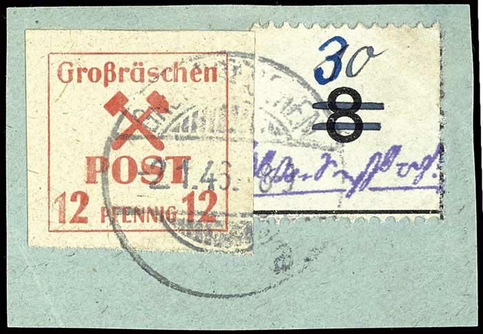 | Zusatzinformationen und Suchstichworte: | Dr. Reinhard Fischer 188. Auktion 1. - 3. September 2022 Los 3676 Deutsche Lokalausgabe Grossräschen 30 Pfg Uhrzeitklebezettel mit verbesserter Wertangabe "10" zusammen mit 12 Pfg Freimarke auf Briefstück, gestempelt "GROSSRÄSCHEN 2.1.46", leichte Eckbüge rechts oben, seltene Marke in besserer Mischfrankatur, Fotobefund Kunz BPP (2018), Mi. 550.-+ Zuschlag 90,00 EUR |