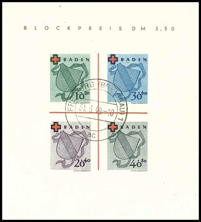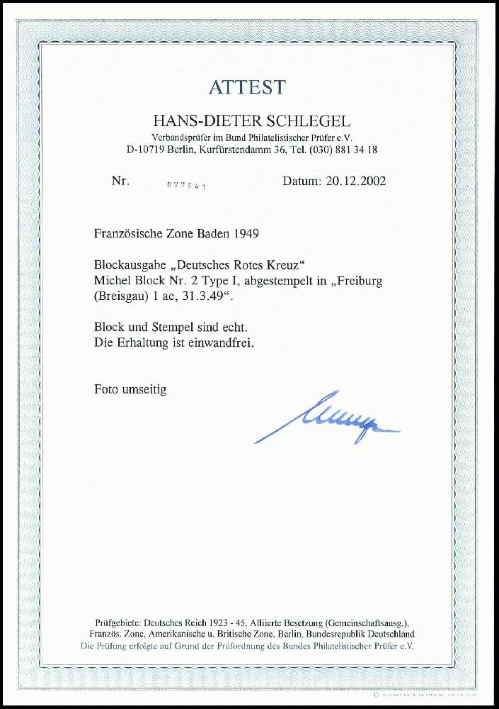 | Zusatzinformationen und Suchstichworte: | Dr. Reinhard Fischer 188. Auktion 1. - 3. September 2022 Los 4205 Französische Zone Baden Blockausgabe Rotes Kreuz, Type I, tadellos gestempelt "FREIBURG (BREISGAU) 1 31.3.49", Fotoattest H.-D. Schlegel BPP: "Block und Stempel sind echt. Die Erhaltung ist einwandfrei.", Mi. 1.500.- Ausruf 450,00 EUR |