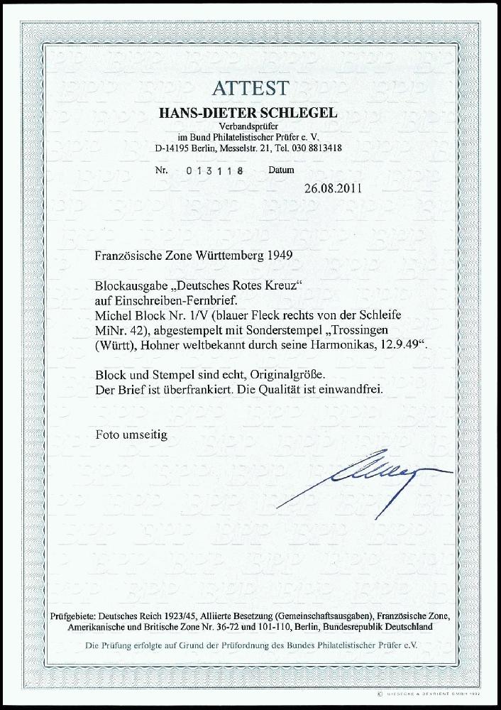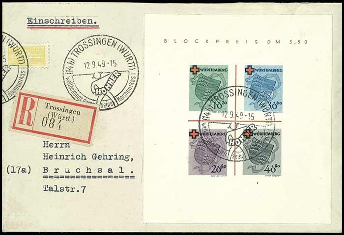 | Zusatzinformationen und Suchstichworte: | Dr. Reinhard Fischer 188. Auktion 1. - 3. September 2022 Los 4230 Französische Württemberg Rotes Kreuz-Block, Type V, mit Sonderstempel "TROSSINGEN/Hohner weltbekannt durch seine Harmonikas/ 12.9.49" auf überfrankiertem R-Brief nach Bruchsal mit Ankunftsstempel, Fotoattest Schlegel D. BPP Zuschlag 400,00 EUR |