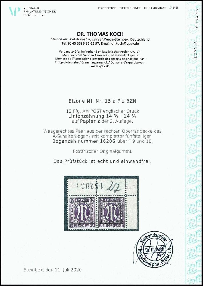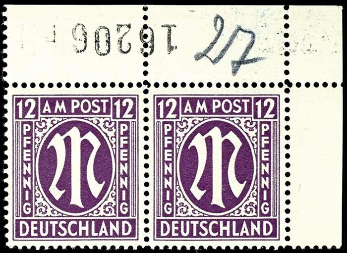 | Zusatzinformationen und Suchstichworte: | Dr. Reinhard Fischer 188. Auktion 1. - 3. September 2022 Los 4246 Bizone 12 Pfg AM-Post dunkelrotviolett, englischer Druck, Zähnung F und auf Papier z, waagerechtes Paar mit linker oberer Bogenecke und Bogenzählnummer "16206", tadellos postfrisch, unsigniertes Kabinettstück, in dieser Variante sehr selten, Fotoattest Dr. Koch VP (2020) "Postfrischer Originalgummi. Das Prüfstück ist echt und einwandfrei.", Mi. 1.200.- Ausruf 100,00 EUR |