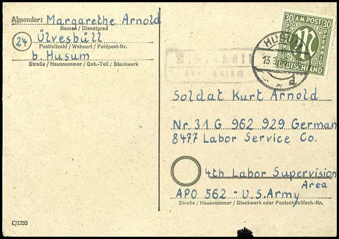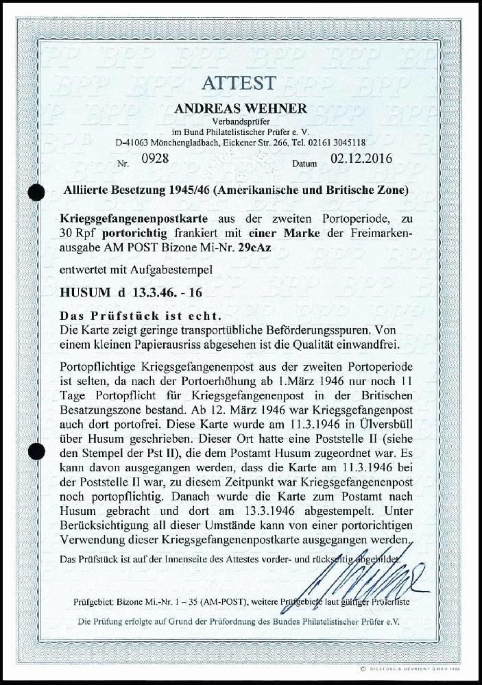 | Zusatzinformationen und Suchstichworte: | Dr. Reinhard Fischer 188. Auktion 1. - 3. September 2022 Los 4255 Bizone 30 Pfg. AM-Post, sehr seltene Einzelfrankatur auf Kriegsgefangenenpostkarte, laut Fotoattest Wehner kann trotz Poststempel HUSUM 13.3.46 davon ausgegangen werden, dass die Sendung am 11.3.46 noch portopflichtig in Ülversvüll (Poststelle II) aufgegeben wurde. Außer einem kleinem Papierausriss und geringen Beförderungsspuren in einwandfreier Erhaltung, Mi. 1.000.- Ausruf 250,00 EUR |