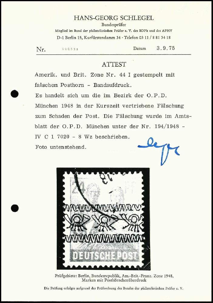 | Zusatzinformationen und Suchstichworte: | Dr. Reinhard Fischer 188. Auktion 1. - 3. September 2022 Los 4261 Bizone 24 Pfg. falscher Bandaufdruck zum Schaden der Post, gestempelt, Fälscher hatte die Marken in München-Pasing umgetauscht, als die Fälschung erkannt wurde, waren bereits einige Werte am Postschalter wieder ausgegeben. Fotoattest Schlegel BPP mit entsprechendem Amtsblattauszug , Mi. für ** 500.- Ausruf 300,00 EUR |