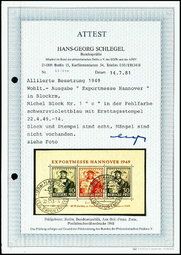 | Zusatzinformationen und Suchstichworte: | Dr. Reinhard Fischer 188. Auktion 1. - 3. September 2022 Los 4280 Bizone Blockausgabe Exportmesse Hannover, dabei die 30 Pfg schwarzviolettultramarin, tadellos gestempelt ESST "(20a) HANNOVER 22.4.49", Fotoattest H.-G. Schlegel BPP: "Block und Stempel sind echt, Mängel sind nicht vorhanden.", Mi. 2.000.- Ausruf 450,00 EUR |