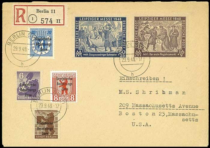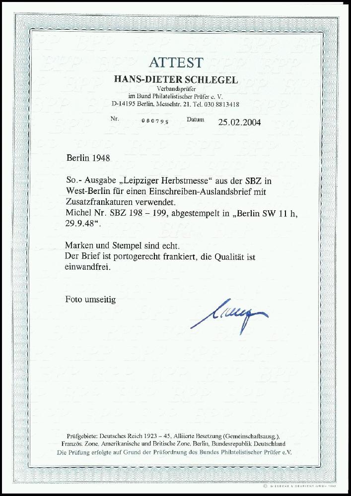 | Zusatzinformationen und Suchstichworte: | Dr. Reinhard Fischer 188. Auktion 1. - 3. September 2022 Los 4125 Berlin Vorläufer SBZ 10 und 50 Pfg. Leipziger Herbstmesse mit Zusatzfrankatur auf portogerechtem R-Brief von "BERLIN SW 11/29.9.48" nach USA mit Ankunftsstempel, Fotoattest Schlegel D. BPP Ausruf 300,00 EUR |