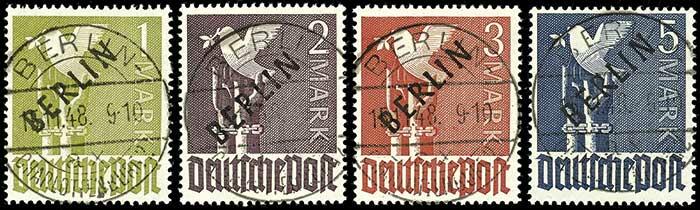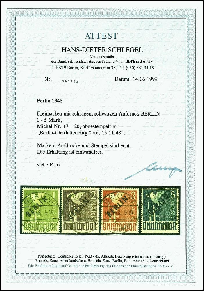 | Zusatzinformationen und Suchstichworte: | Dr. Reinhard Fischer 188. Auktion 1. - 3. September 2022 Los 4131 Berlin 1 Mark bis 5 Mark Schwarzaufdruck, vier Werte, jeder Wert zentrisch gestempelt "Berlin-Charlottenburg 2ax 15.11.48", unsigniert, Fotoattest H.-D. Schlegel BPP: "Die Erhaltung ist einwandfrei.", Mi. 2.100.- Zuschlag 520,00 EUR |