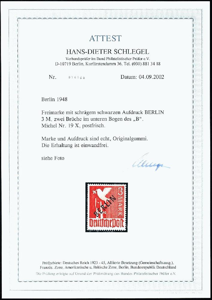 | Zusatzinformationen und Suchstichworte: | Dr. Reinhard Fischer 188. Auktion 1. - 3. September 2022 Los 4141 Berlin 3 Mark Schwarzaufdruck, Aufdruckfehler X "zwei Brüche im unteren Bogen des B", postfrisch, tadellose Erhaltung, unsigniert, Fotoattest H.-D. Schlegel BPP: "Die Qualität ist einwandfrei.", Mi. 750.- Ausruf 130,00 EUR |