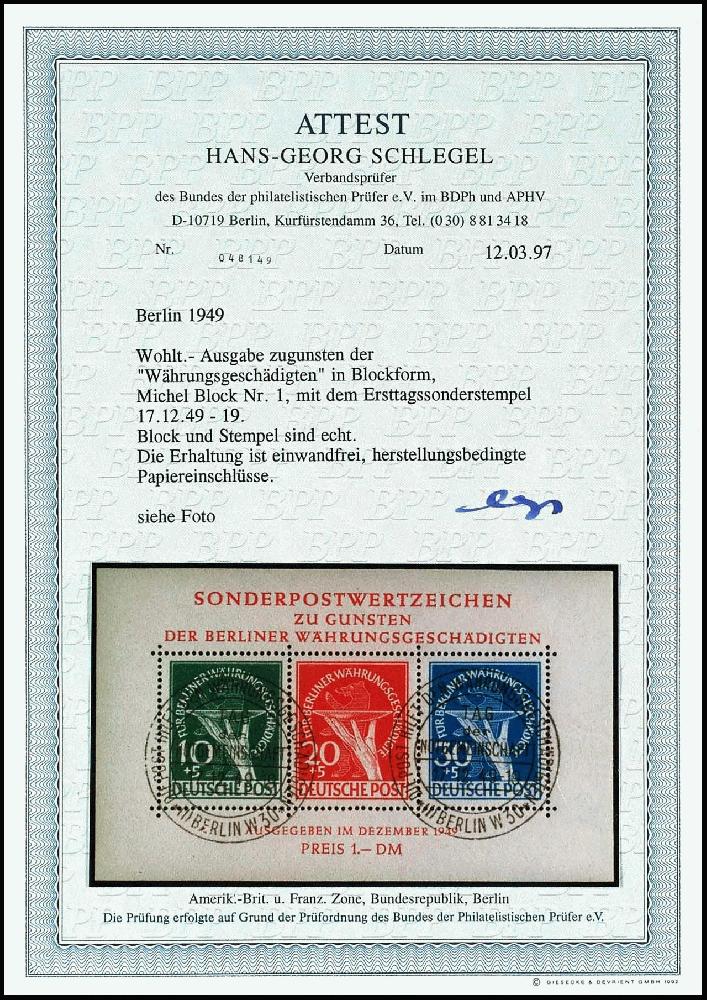 | Zusatzinformationen und Suchstichworte: | Dr. Reinhard Fischer 188. Auktion 1. - 3. September 2022 Los 4171 Berlin Blockausgabe Währungsgeschädigte mit Plattenfehler III "grüner Punkt rechts am Handgelenk auf der 10 Pfg-Marke", gestempelt mit ESST "BERLIN W30 17.12.1949", tadellose Erhaltung, Fotoattest H.-G. Schlegel BPP: "Block und Stempel sind echt. Die Erhaltungist einwandfrei.", Mi. 3.500.- Zuschlag 750,00 EUR |