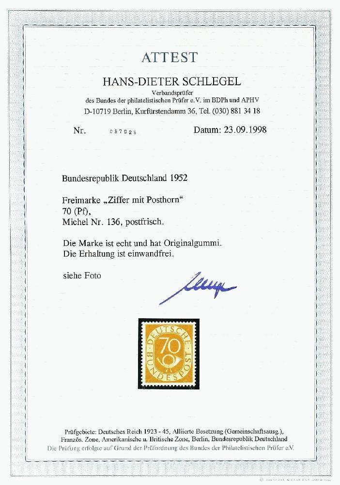 | Zusatzinformationen und Suchstichworte: | Dr. Reinhard Fischer 188. Auktion 1. - 3. September 2022 Los 4305 Bundesrepublik Deutschland 70 Pfg. Posthorn, postfrisch, Fotoattest Schlegel D. BPP "die Erhaltung ist einwandfrei", Mi. 500.- Zuschlag 120,00 EUR |