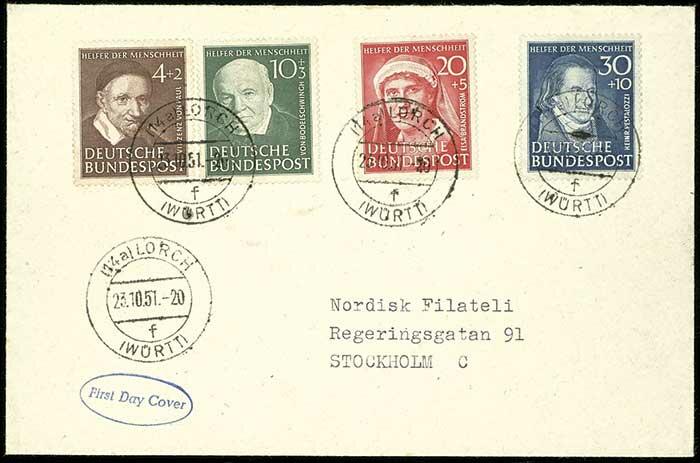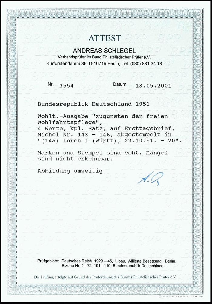 | Zusatzinformationen und Suchstichworte: | Dr. Reinhard Fischer 188. Auktion 1. - 3. September 2022 Los 4311 Bundesrepublik Deutschland 4 Pfg - 30 Pfg Helfer der Menschheit (II), 4 Werte komplett, auf FDC von "(14a) LORCH (WÜRTT) f 23.10.51" nach Stockholm / Schweden adressiert, tadellos erhalten, einer der seltensten Ersttagsbriefe der Bundesrepublik, Fotobefund A. Schlegel BPP: "Marken und Stempel sind echt. Mängel sind nicht erkennbar.", Mi. 1.400.- Ausruf 400,00 EUR |