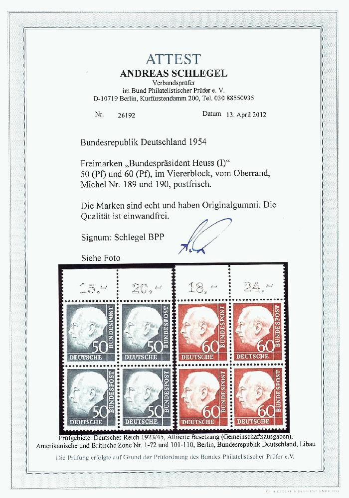 | Zusatzinformationen und Suchstichworte: | Dr. Reinhard Fischer 188. Auktion 1. - 3. September 2022 Los 4334 Bundesrepublik Deutschland 50 u. 60 Pfg. Heuss, postfrische 4er - Blocks vom Oberrand, geprüft und Fotoattest Schlegel A. BPP, Mi. 1.840.- Ausruf 400,00 EUR |