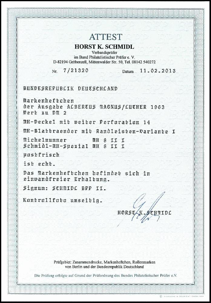 | Zusatzinformationen und Suchstichworte: | Dr. Reinhard Fischer 188. Auktion 1. - 3. September 2022 Los 4353 Bundesrepublik Deutschland 1963, Markenheftchen Albertus/Luther, 14 Kerben in der Deckelperforation, postfrisch, geprüft und Fotoattest Schmidl BPP, Mi. 600,- Ausruf 150,00 EUR |