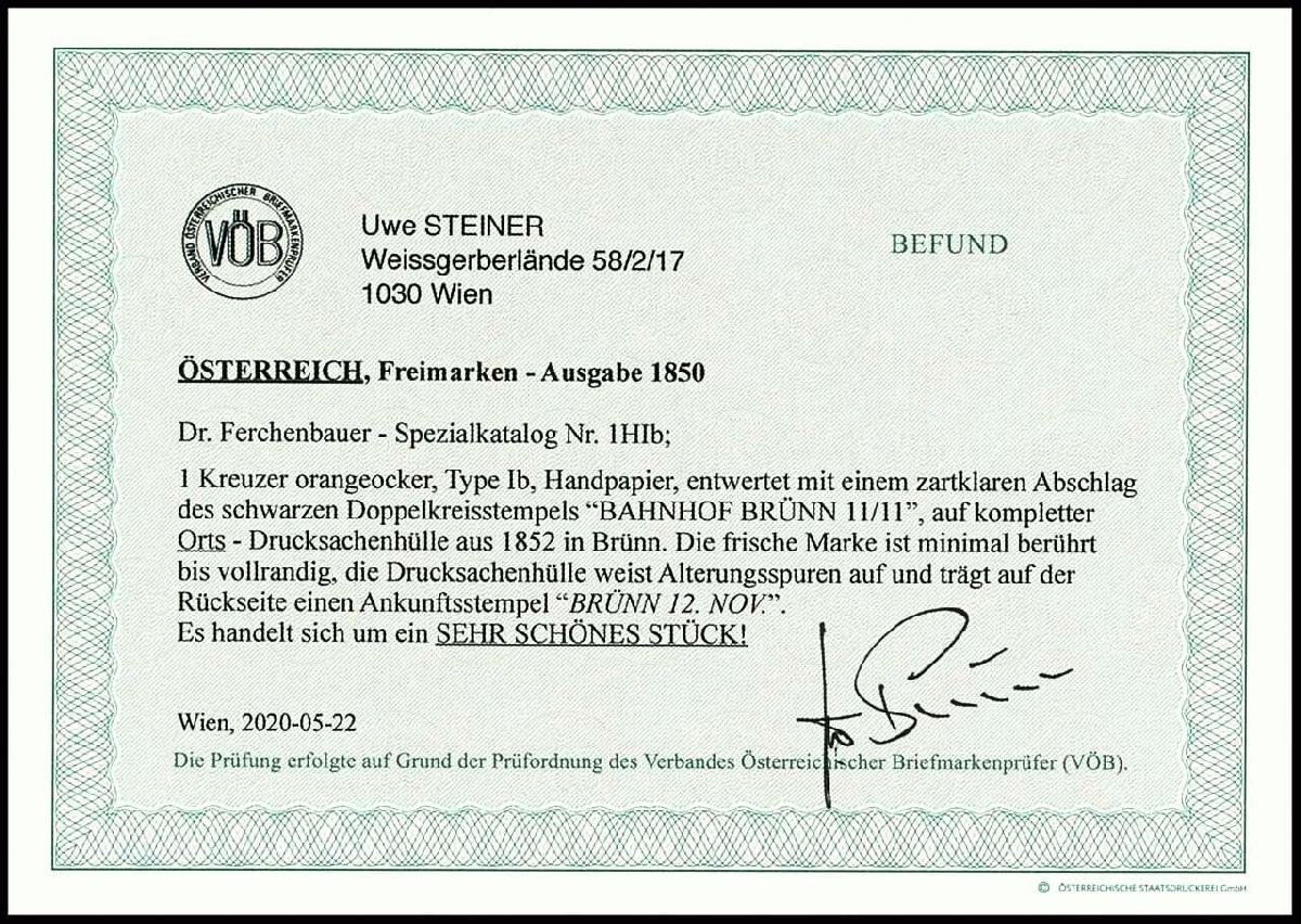 | Zusatzinformationen und Suchstichworte: | Dr. Reinhard Fischer 188. Auktion 1. - 3. September 2022 Los 4443 Österreich 1 Kreuzer, orangeocker, Handpapier Type Ib, auf Orts-Drucksache, klarer K2 "BAHNHOF BRÜNN 11/11" (1852) und Ankunftsstempel, Fotobefund Steiner VÖB (2020): "Die frische Marke ist minimal berührt bis vollrandig, die Drucksachenhülle weist Alterungsspurenauf. Es handelt sich um ein sehr schönes Stück. Fb. 570,- Ausruf 90,00 EUR |