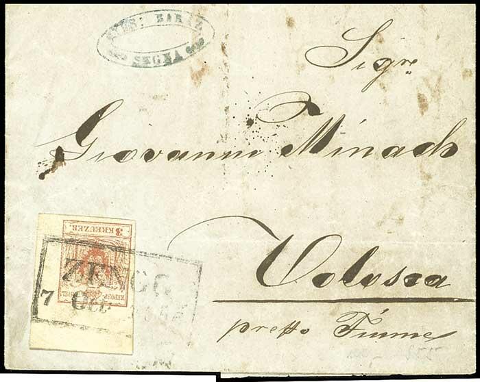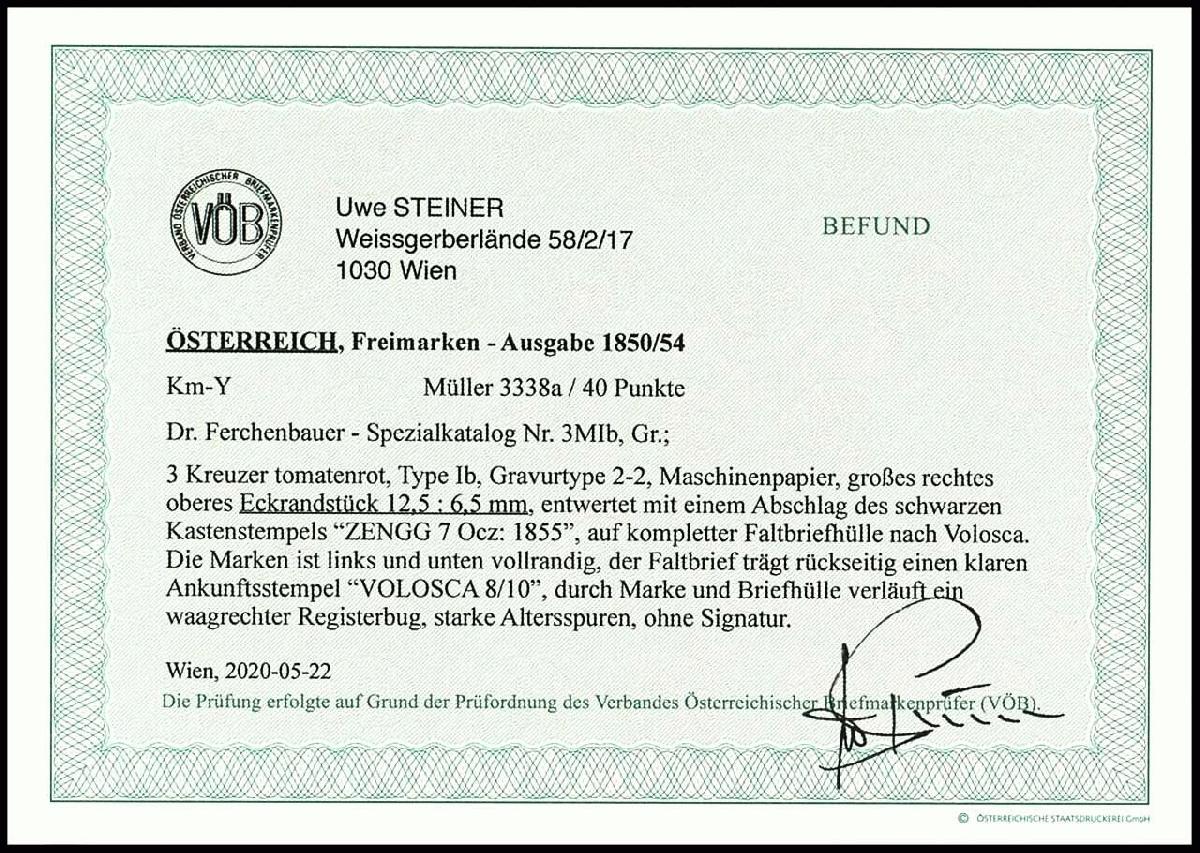 | Zusatzinformationen und Suchstichworte: | Dr. Reinhard Fischer 188. Auktion 1. - 3. September 2022 Los 4454 Österreich 3 Kreuzer tomatenrot, Maschinenpapier Type Ib, Gravurtype 2-2, vollrandige große rechte obere Bogenecke 12,5 : 6,5 mm auf Brief von "ZENGG 7 Oct. 1855" (Ra2 Müller Nr. 3338a, 40 Punkte) nach Volosca mit Ankunftsstempel. durch Brief und Marke waagerechter Registraturbug, Alterungsspuren, Fotobefund Steiner VÖB (2020), Fb. 2.500,- Ausruf 250,00 EUR |