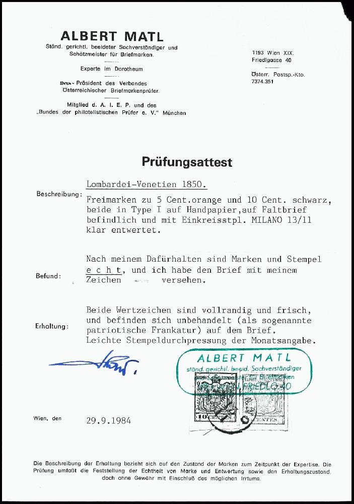 | Zusatzinformationen und Suchstichworte: | Dr. Reinhard Fischer 188. Auktion 1. - 3. September 2022 Los 4749 Österreich Lombardei Venetien 5 Centesimi gelbocker mit 10 Centesimi schwarz, je Handpapier Type I, als Buntfrankatur, sog. patriotische Frankatur, auf sauberem Brief von "MILANO 13/11" (K1) nach Cremona, Marken farbfrisch und allseits voll- bis breitrandig (leichte Stempeldurchpressung der Monatszahl), sign. und Fotoattest Matl VÖB, Fb. 1.000,- Ausruf 250,00 EUR |