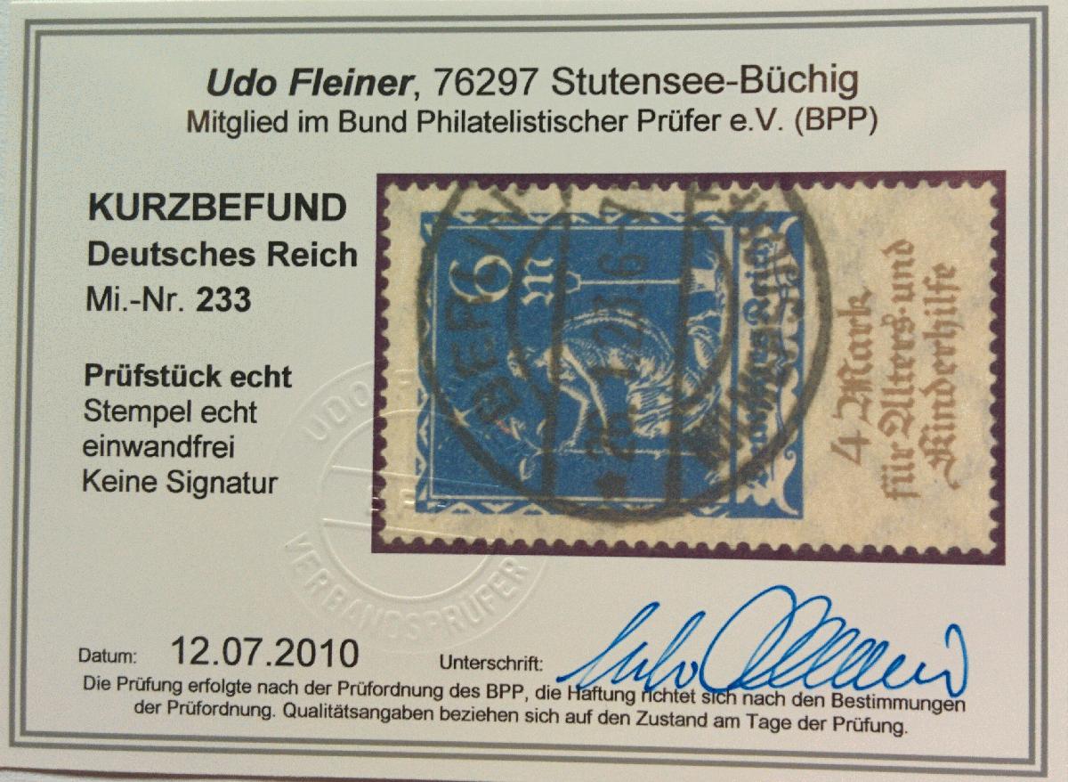 | Prüfer: | Fleiner, Udo (BPP (Bund Philatelistischer Prüfer)) |