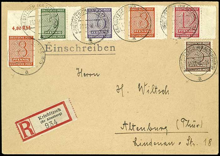 | Zusatzinformationen und Suchstichworte: | Dr. Reinhard Fischer 188. Auktion 1. - 3. September 2022 Los 3853 Sowjetische Zone 5 - 12 Pfg. Ziffer mit Nähmaschinen-Durchstich, alle vom rechten Bogenrand, mit Zusatzfrankatur auf portogerechtem R-Brief von "KRIEBITZSCH 21.12.46" (falsche Jahreszahl 46 statt 45 eingestellt) nach Altenburg mit Ankunftsstempel, Fotoattest Ströh BPP Ausruf 250,00 EUR |