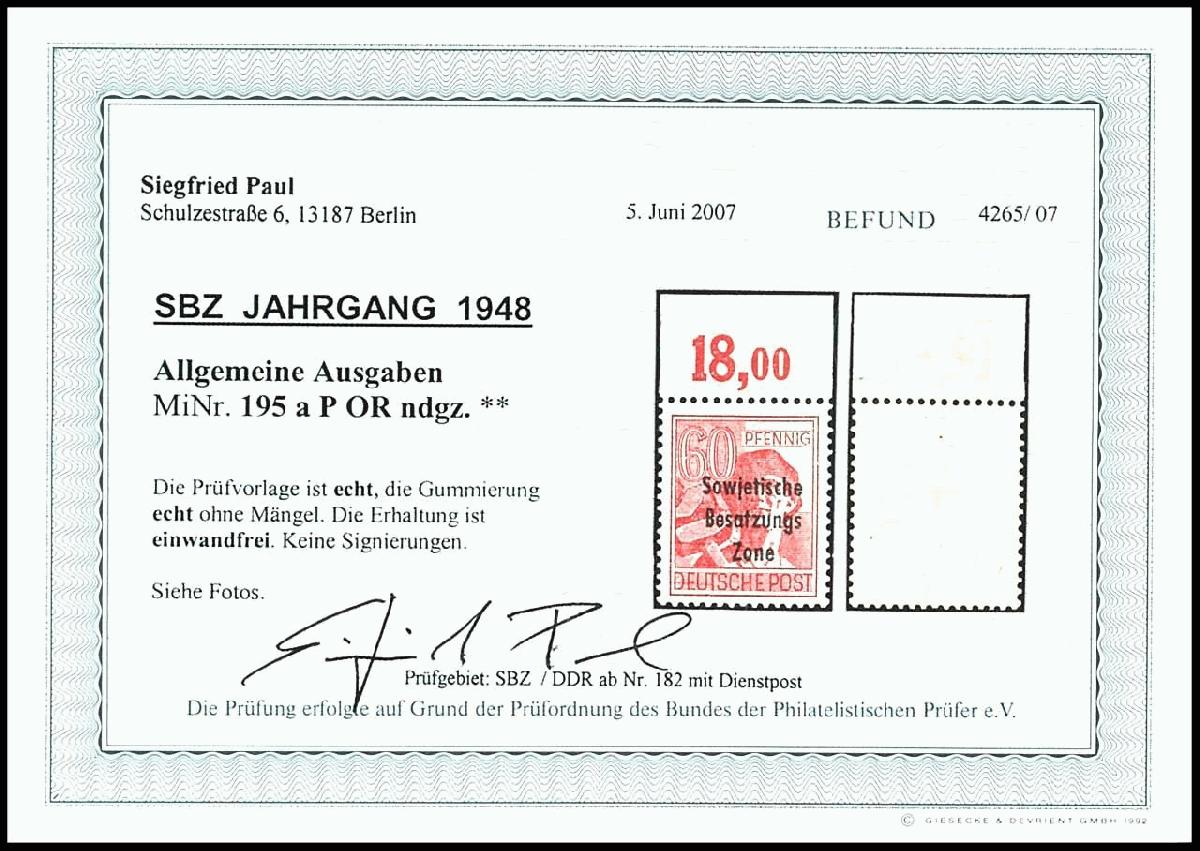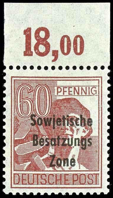 | Zusatzinformationen und Suchstichworte: | Dr. Reinhard Fischer 188. Auktion 1. - 3. September 2022 Los 3876 Sowjetische Zone 60 Pfg. Arbeiter karminrot, Plattendruck mit nicht durchgezähntem Oberrand, postfrisch, tadellose Erhaltung, Fotobefund Paul BPP: "echt und einwandfrei", Mi. 250.- Zuschlag 50,00 EUR |