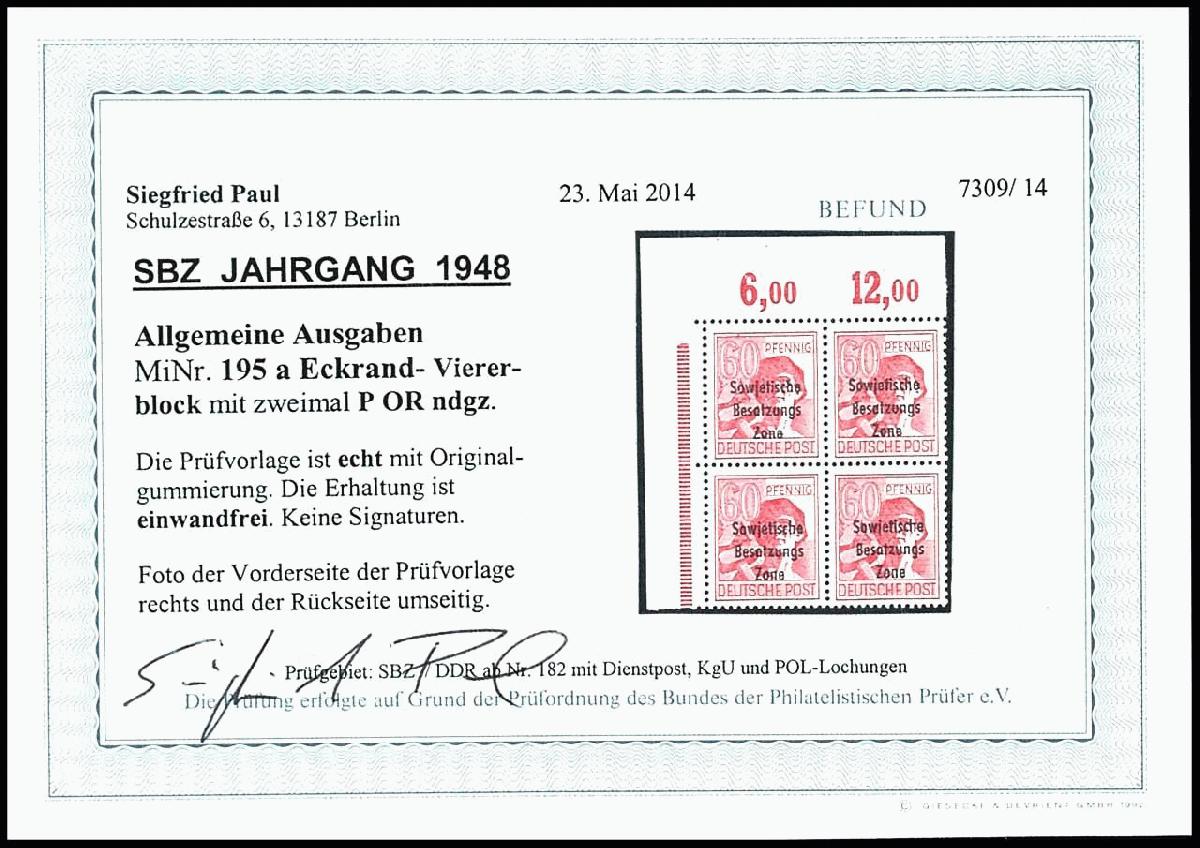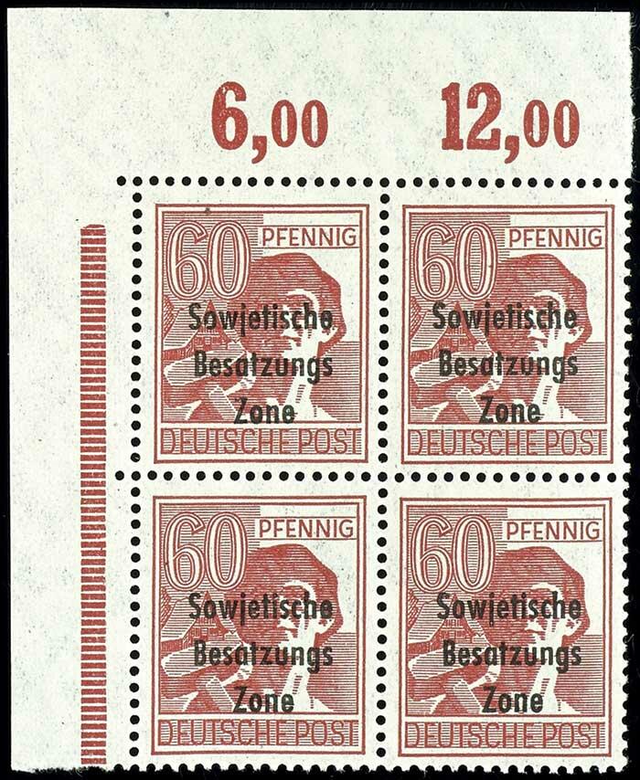 | Zusatzinformationen und Suchstichworte: | Dr. Reinhard Fischer 188. Auktion 1. - 3. September 2022 Los 3878 Sowjetische Zone 60 Pfg Maschinenaufdruckausgabe rotkarmin, Eckrandviererblock oben links, Plattenoberrand ndgz., tadellos postfrisch, Fotobefund Paul BPP: "echt und einwandfrei", Mi. 640.-++ Ausruf 100,00 EUR |