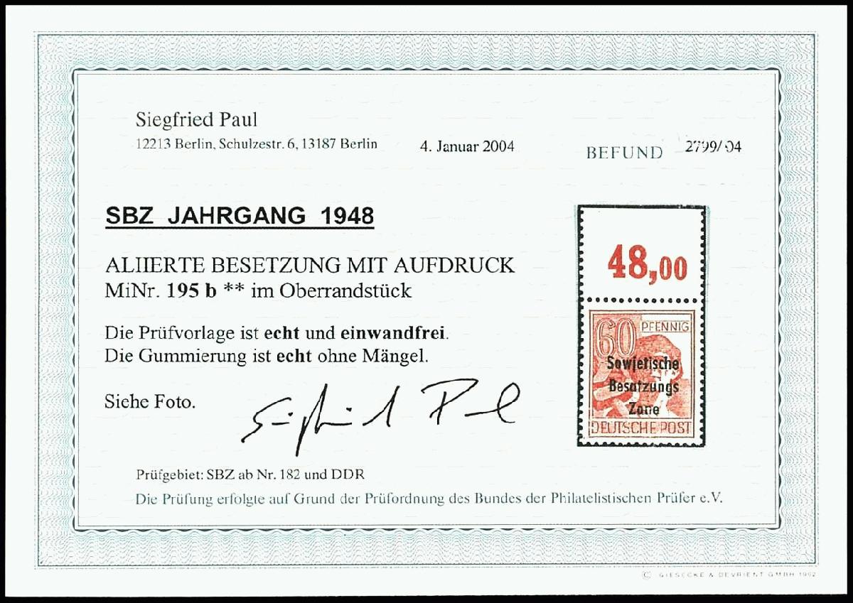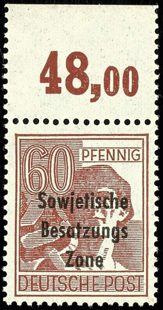 | Zusatzinformationen und Suchstichworte: | Dr. Reinhard Fischer 188. Auktion 1. - 3. September 2022 Los 3883 Sowjetische Zone 60 Pfg Arbeiter braunrot, Plattendruck mit durchgezähntem Oberrand, postfrisch, Fotobefund Paul BPP, Mi. 900.- Zuschlag 190,00 EUR |