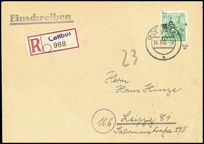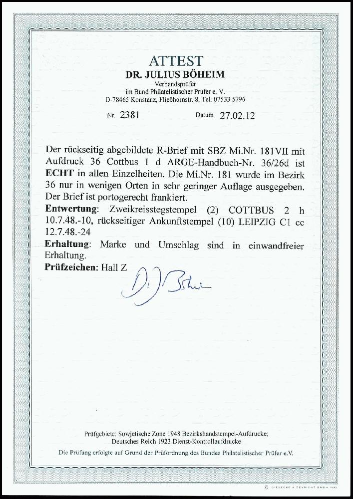 | Zusatzinformationen und Suchstichworte: | Dr. Reinhard Fischer 188. Auktion 1. - 3. September 2022 Los 3963 SBZ Handstempel Bezirk 36 84 Pfennig mit Aufdruck 36 Cottbus 1 d, tadelloser Einschreibebrief nach Halle mit Ankunftsstempel, Fotoattest Dr. Böheim BPP, Mi. 2000,- Zuschlag 950,00 EUR |