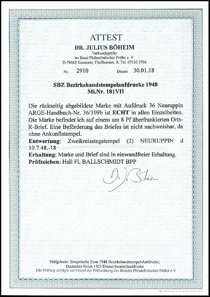 | Prüfgebiet: | Alliierte Besetzung SBZ Bezirkshandstempel Bezirk 36 |