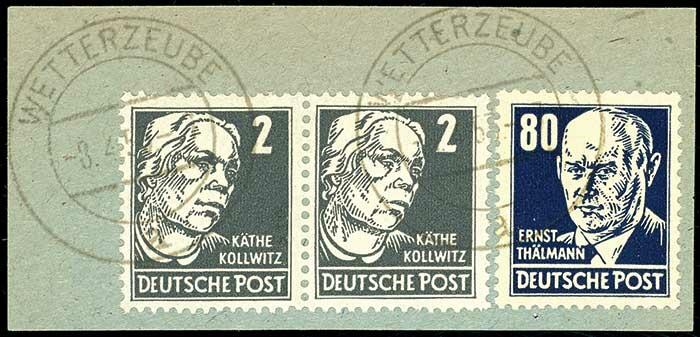 | Zusatzinformationen und Suchstichworte: | Dr. Reinhard Fischer 188. Auktion 1. - 3. September 2022 Los 4028 DDR 80 Pfg Köpfe, gestrichenes Papier mit Lacküberzug, zusammen mit 2 Pfg Köpfe, waagerechtes Paar, auf Briefstück, zeitgerecht gestempelt "WETTERZEUBE 8.4.53", tadellose Erhaltung, zeitgerechte Verwendungen sind selten, Fotoattest Paul BPP: "Die Marke ist echt und einwandfrei in tadelloser Erhaltung. Die Stempelabschläge sind echt und zeitgerecht.", Mi. 1.600.-+ Ausruf 400,00 EUR |
