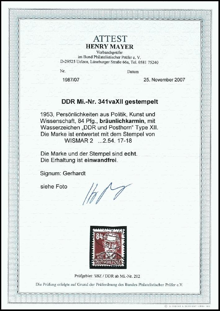 | Zusatzinformationen und Suchstichworte: | Dr. Reinhard Fischer 188. Auktion 1. - 3. September 2022 Los 4030 DDR 84 Pfg Köpfe bräunlichkarmin, Wz. XII, tadellos gestempelt "WISMAR 2 .. .2.54", gepr. Gerhardt und Fotoattest Mayer BPP: "Die Marke und der Stempel sind echt. Die Erhaltung ist einwandfrei.", Mi. 350.- Ausruf 75,00 EUR |