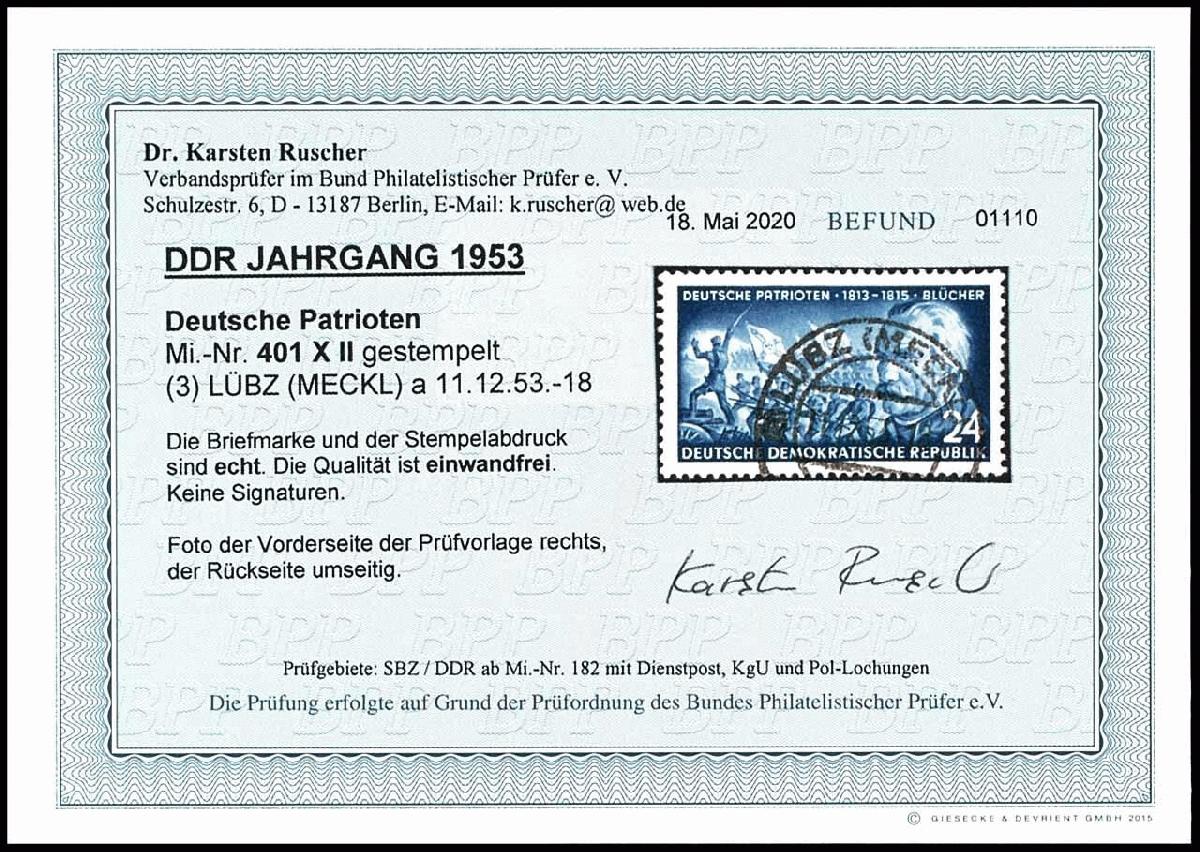 | Zusatzinformationen und Suchstichworte: | Dr. Reinhard Fischer 188. Auktion 1. - 3. September 2022 Los 4044 DDR 24 Pfg. Deutsche Patrioten mit Wasserzeichen XII, gestempelt "LÜBZ 11.12.53", tadellos, Fotobefund Ruscher BPP, Mi. 400,- Zuschlag 160,00 EUR |