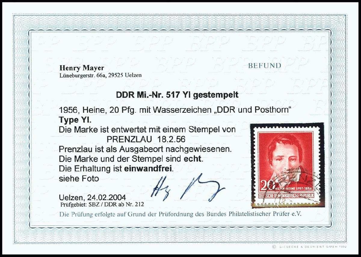 | Zusatzinformationen und Suchstichworte: | Dr. Reinhard Fischer 188. Auktion 1. - 3. September 2022 Los 4075 DDR 20 Pfg Heinrich Heine mit Wasserzeichen YI, tadellos gestempelt "PRENZLAU 18.2.56", in gestempelter Erhaltung seltene Marke, Fotobefund Mayer BPP: "Prenzlau ist als Ausgabeort nachgewiesen. Die Marke und der Stempel sind echt. Die Erhaltung ist einwandfrei.", Mi. 500.- Zuschlag 110,00 EUR |