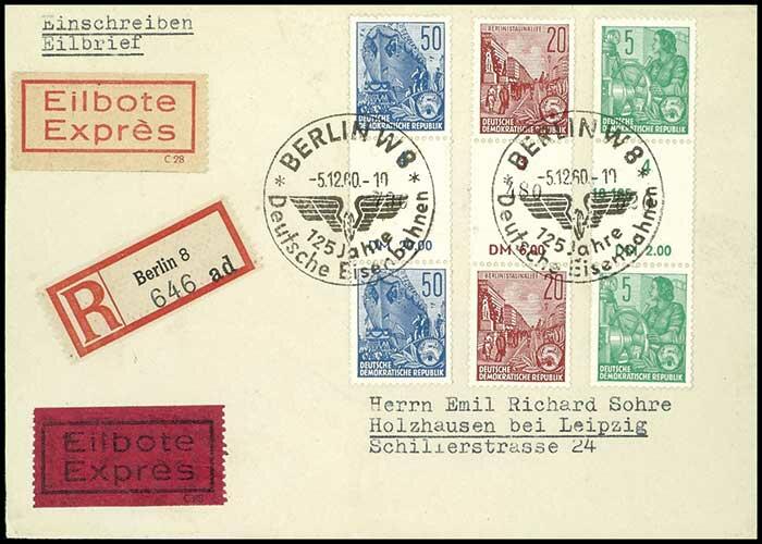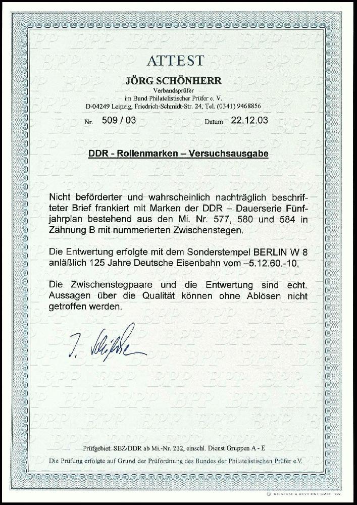 | Zusatzinformationen und Suchstichworte: | Dr. Reinhard Fischer 188. Auktion 1. - 3. September 2022 Los 4082 DDR 5, 20 und 50 Pfg. Fünfjahrplan, Rollenmarken-Versuchsausgabe, senkr. Paare mit nummerierten Zwischenstegen aus nicht beförderten und wahrscheinlich nachträglich beschrifteten Brief mit Sonderstpl., Fotoattest Schönherr BPP: "Zwischenstegpaare und Entwertung echt", Mi. Markenwert 3.600,- Zuschlag 720,00 EUR |
