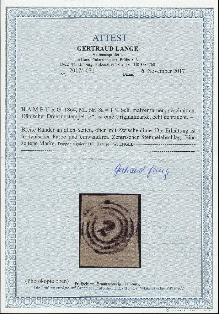 | Zusatzinformationen und Suchstichworte: | 366. Auktion Heinrich Köhler Auktionstermin 19.–24.03.2018 Los 2970 1¼ S. hellflieder, farbfrisch und allseits breitrandig, oben mit Zwischenlinie, geschnitten, sauber mit Dreiringstempel "2" entwertet, eine seltene Marke in tadelloser Erhaltung, u.a. sign. W. Engel und Fotoattest Lange BPP (2017) Ausruf 250,00 EUR |