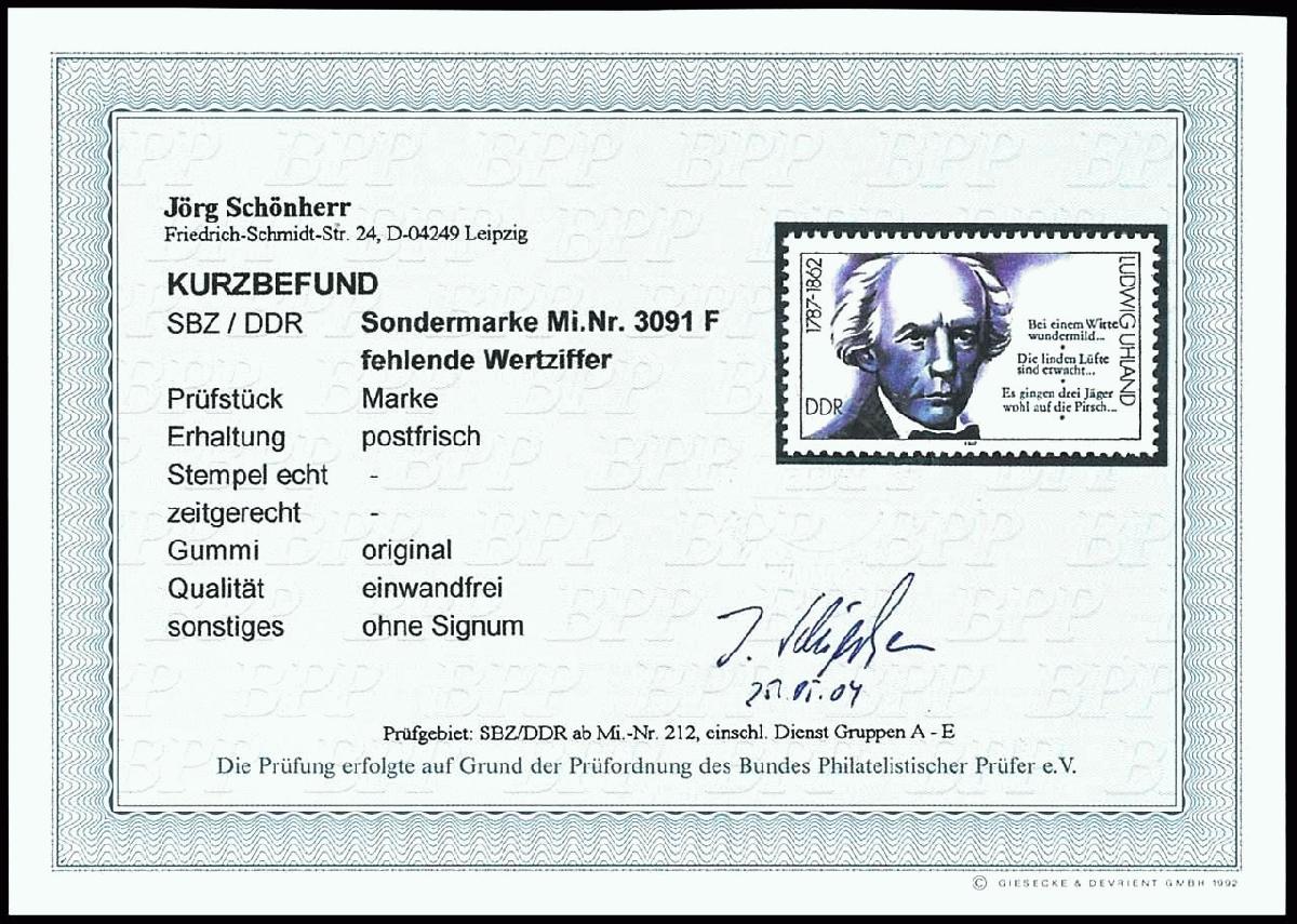 | Zusatzinformationen und Suchstichworte: | Dr. Reinhard Fischer 188. Auktion 1. - 3. September 2022 Los 4096 DDR 10 Pfg. Uhland, fehlende Wertziffer, postfrisch, Fotobefund Schönherr BPP: "echt und einwandfrei", Mi. 400,- Zuschlag 95,00 EUR |