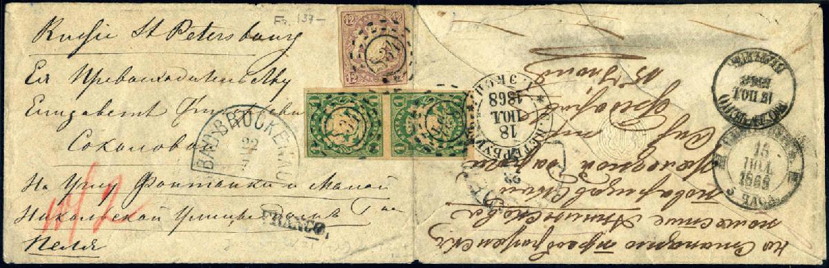 | Zusatzinformationen und Suchstichworte: | 75. AAK Phila GmbH Auktion 9. September 2022 Los 1130 (D) Altdeutschland Bayern 18 Kr u. senkr. Paar 1 Kr in guter Farbe (teilsweise rs. frankiert) als dekorative MiF a. dreiseitig geöffnetem FRANCO-Bf. v. "834" BAD BRÜCKENAU (Halbkreis-Stpl.) über Gemünden n. St. Petersburg (AKS) m. ausführlichem FA BPSB "ein interessanter Destinationsbrief" Ausruf 500,00 EUR |