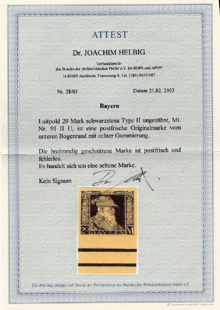 | Zusatzinformationen und Suchstichworte: | 75. AAK Phila GmbH Auktion 9. September 2022 Los 1157 (D) Altdeutschland Bayern 20 M Luitpold ungezähnt v. Unterrand in Type II, postfr. Luxus m. einwandfreiem FA Helbig BPP! RR Ausruf 180,00 EUR |