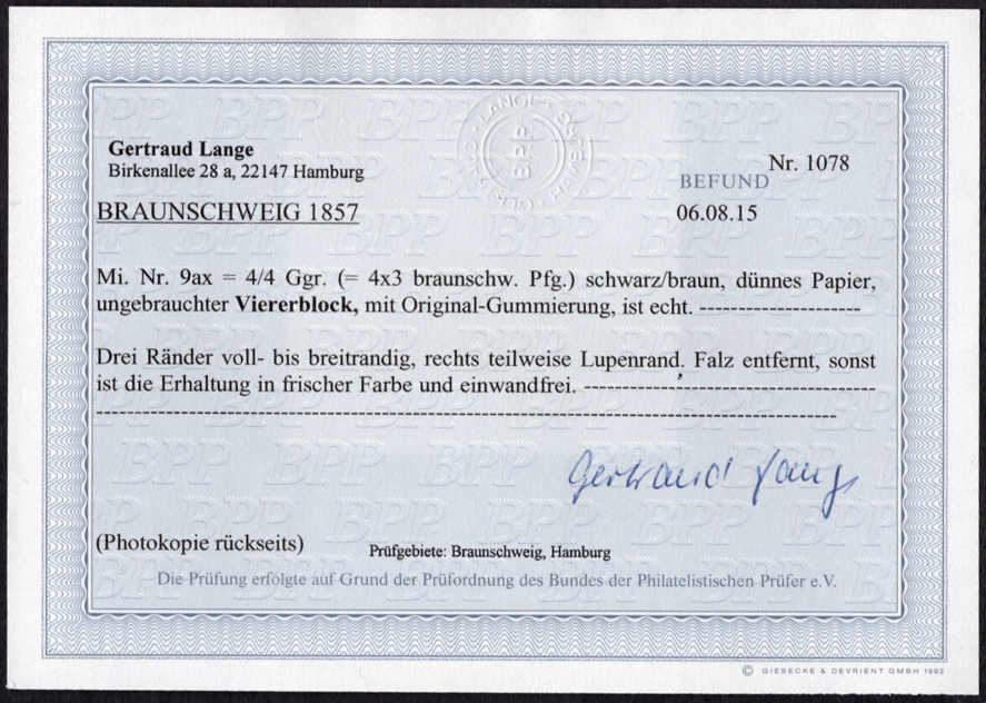 | Zusatzinformationen und Suchstichworte: | 75. AAK Phila GmbH Auktion 9. September 2022 Los 1223 (D) Altdeutschland Braunschweig 4/4 Ggr schwarz a. graubraun a. dünnem Papier im ungebr. 4er-Bl. (Falz entfernt, wie postfr. wirkend), re. teils lupen-, sonst vollrandig Luxus m. einwandfreiem Befund Lange BPP, RR Ausruf 350,00 EUR |