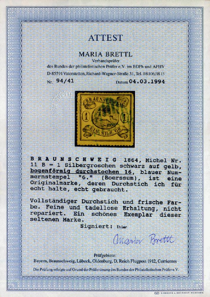 | Zusatzinformationen und Suchstichworte: | 75. AAK Phila GmbH Auktion 9. September 2022 Los 1230 (D) Altdeutschland Braunschweig 1 Sgr schwarz a. graugelb m. Versuchsdurchstich 16 m. blauem Nr.-Stpl. "6", vollständiger Durchstich u. frische Farbe, sign. Thier, Attest APS N.Y., sowie einwandfreies FA Brettl BPP "seltene Marke" Ausruf 500,00 EUR |
