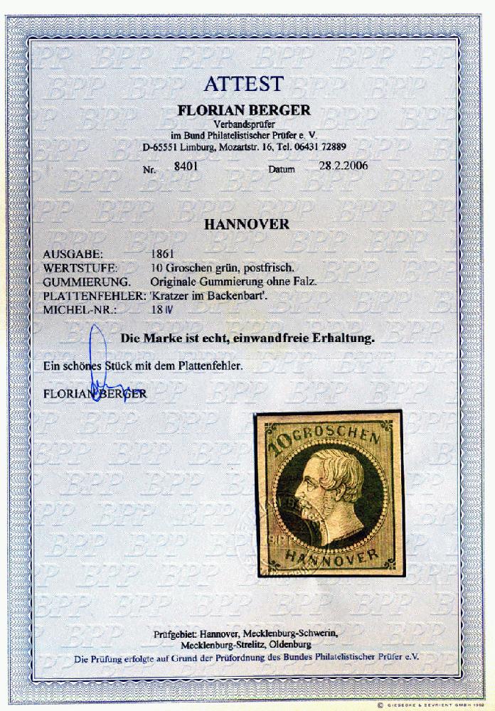 | Zusatzinformationen und Suchstichworte: | 75. AAK Phila GmbH Auktion 9. September 2022 Los 1291 (D) Altdeutschland Hannover 10 Gr grün m. seltenem PF "Kratzer im Backenbart", vollrandig postfr. Luxus m. einwandfreiem FA Berger BPP, Ausnahmequalität! Ausruf 270,00 EUR |