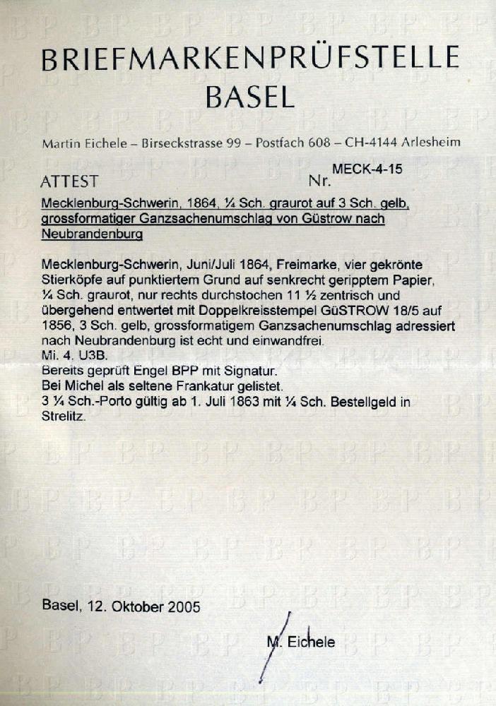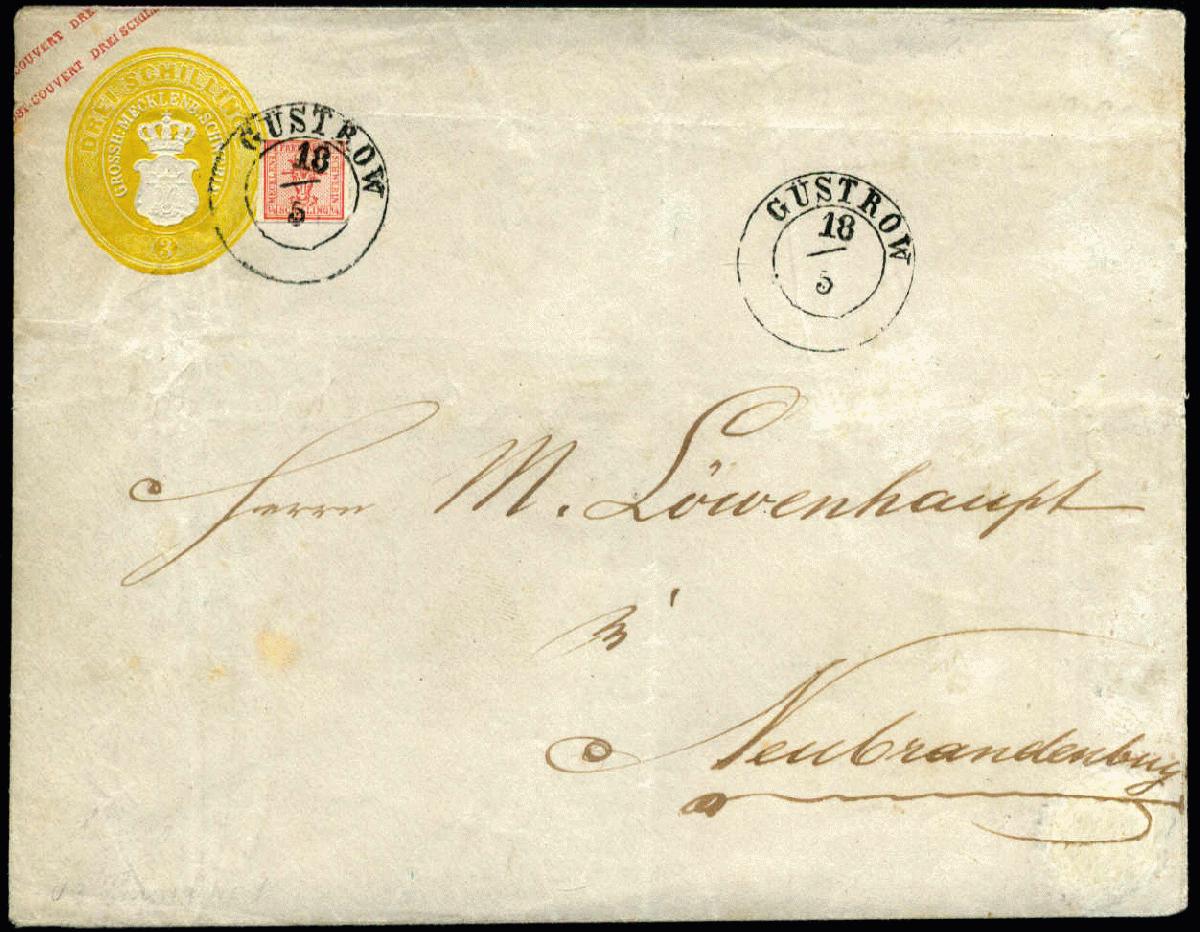 | Zusatzinformationen und Suchstichworte: | 75. AAK Phila GmbH Auktion 9. September 2022 Los 1341 (D) Altdeutschland Mecklenburg Schwerin 1/4 S graurot als ZuF a. 3 S GAU v. GÜSTROW (K2) n. Neubrandenburg, geprüft Engel BPP u. m. einwandfreiem Attest BPSB Zuschlag 210,00 EUR |