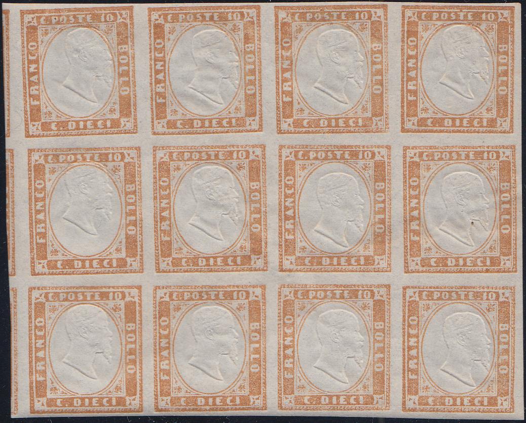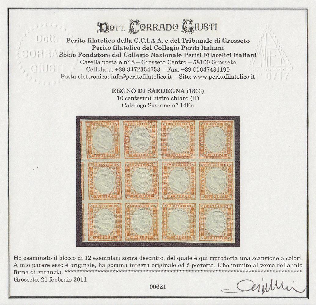 | Zusatzinformationen und Suchstichworte: | Regno di Sardegna (1863) 10 centesimi bistro chiaro (II) Catalogo Sassone no 14Ea Ho esaminato il blocco di 12 esemplari sopra descritto, del quale è qui riprodotta una scansione a colori. A mio parere esso è originale, ha gomma integra originale ed è perfetto. L'ho munito al verso della mia firma di garanzia. Versuch einer Übersetzung: Königreich Sardinien (1863) 10 Cent hellbraun (II) Sassone Katalognummer 14Ea Ich habe den oben beschriebenen Block von 12 Marken untersucht, von denen hier ein Farbscan reproduziert wird. Meiner Meinung nach ist er original, er hat original intakten Gummi und ist perfekt. Ich habe auf der Rückseite meine Garantiesignatur angebracht. |
