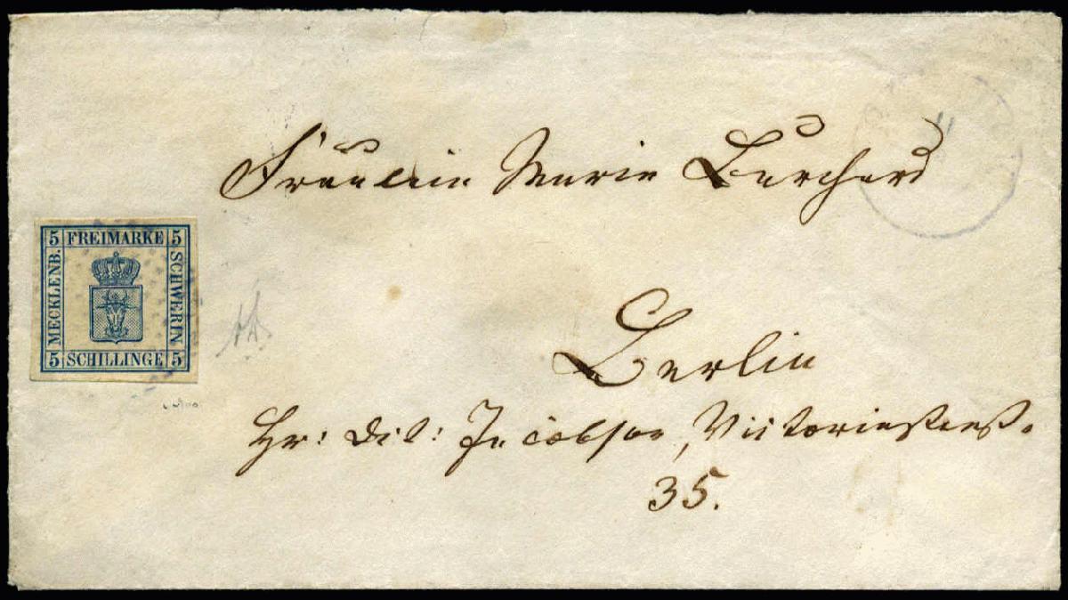 | Zusatzinformationen und Suchstichworte: | 75. AAK Phila GmbH Auktion 9. September 2022 Los 1342 (D) Altdeutschland Mecklenburg Schwerin 5 S blau vollrandig Luxus als portoger. EF a. gesiegeltem Briefumschlag v. Rostock mit seltenem blauen Punktstpl. entwertet n. Berlin (AKS), gepr. A.Diena u. einwandfreies FA Berger BPP Zuschlag 640,00 EUR |