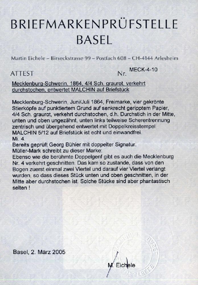 | Zusatzinformationen und Suchstichworte: | 75. AAK Phila GmbH Auktion 9. September 2022 Los 1343 (D) Altdeutschland Mecklenburg Schwerin 4/4 S graurot verkehrt getrennt a. Pracht-Bfstck. MALCHIN (K2), doppelt tiefst gepr. Georg Bühler, einwandfr. FA BPSB u. Befund Berger BPP "echt, li. Scherentrennung, unten etwas tangiert", dekoratives Bfstck. dieser Abart! Zuschlag 820,00 EUR |