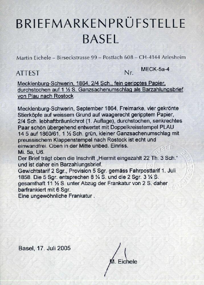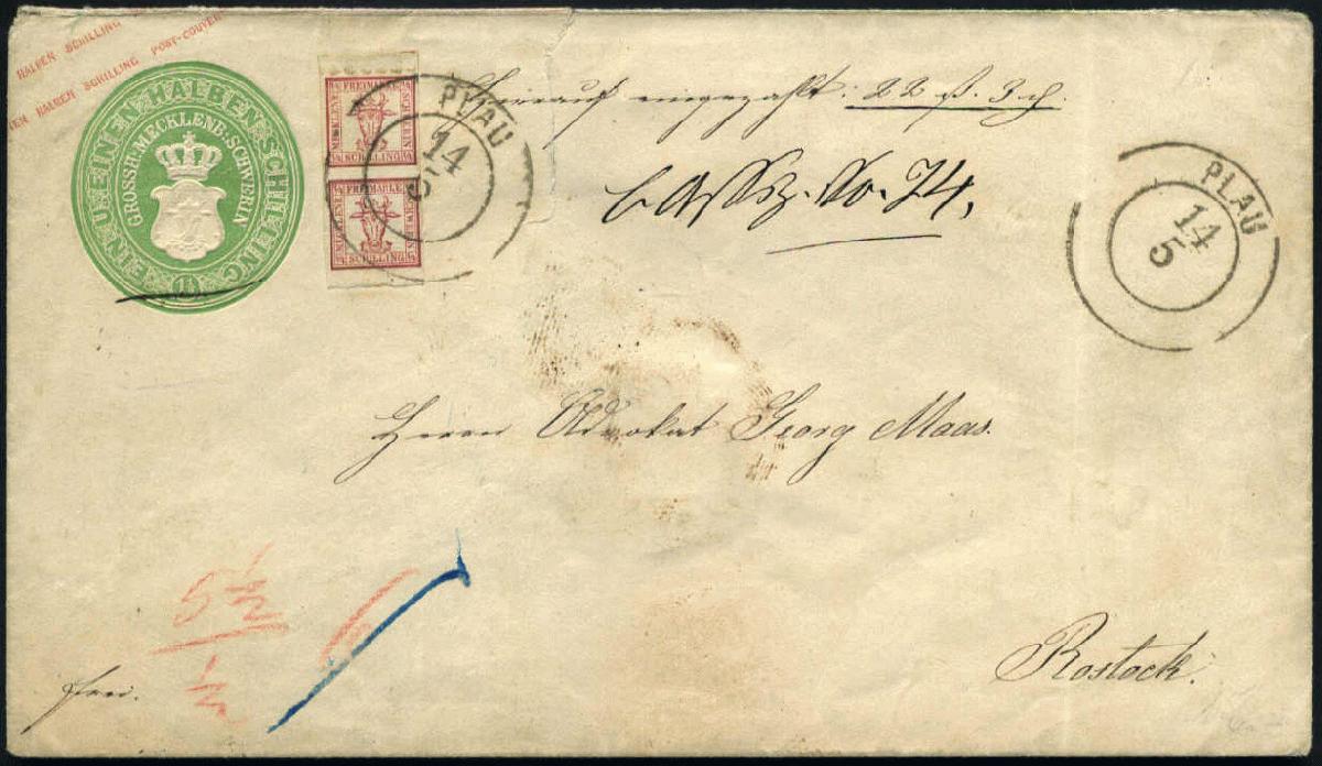 | Zusatzinformationen und Suchstichworte: | 75. AAK Phila GmbH Auktion 9. September 2022 Los 1344 (D) Altdeutschland Mecklenburg Schwerin 2/4 S lebh´bräunl´rot als ZuF a. 1 1/2 S GAU als Barzahlungsbf. v. PLAU (K2) n. Rostock m. einwandfreiem(oben unbedeutender Einriss) Attest BPSB "ungewöhnliche Frankatur" Ausruf 500,00 EUR |