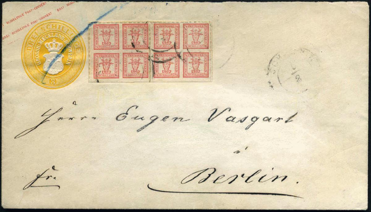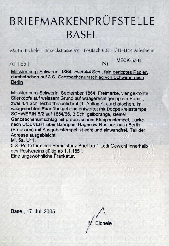 | Zusatzinformationen und Suchstichworte: | 75. AAK Phila GmbH Auktion 9. September 2022 Los 1345 (D) Altdeutschland Mecklenburg Schwerin 4/4 S Stierköpfe im waagr. Paar als ZuF a. 3 S GAU v. Schwerin m. Bahnpost Hagenow-Rostock n. Berlin m. ausführlichem Attest BPSB "Teil der Adresse ausgebleicht (nachgezogen), eine ungewöhnliche Frankatur" Zuschlag 230,00 EUR |