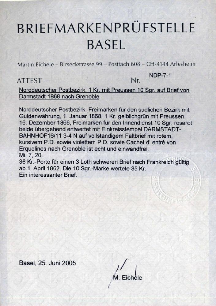 | Zusatzinformationen und Suchstichworte: | 75. AAK Phila GmbH Auktion 9. September 2022 Los 1436 (D) Altdeutschland Preussen 10 Sgr Innendienst m. ZuF NDP 1 Kr a. portoger. P.D.-Bf. v. DARMSTADT-BAHNHOF (K1) n. Grenoble (AKS) m. einwandfreiem Attest BPSB "interessanter Brief" Zuschlag 180,00 EUR |