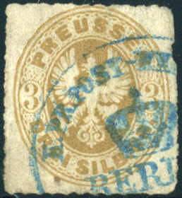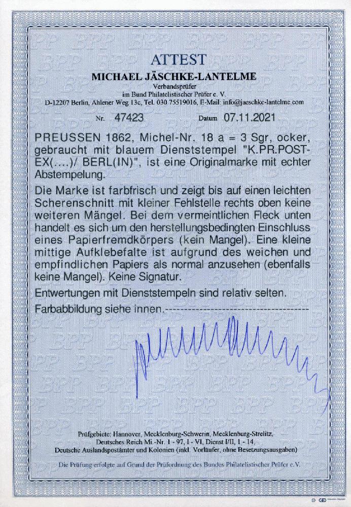| Zusatzinformationen und Suchstichworte: | 75. AAK Phila GmbH Auktion 9. September 2022 Los 1478 Altdeutschland Preussen K. PR. POST-EX(...) BERL(IN) in blau auf 3 Sgr. ocker, FA Jäschke-L. BPP (11/2021) "...bis auf kl. Scherenschnitt m. kl. Fehlstelle re.o. keine weiteren Mängel...Entwertungen m. Dienststempeln sind relativ selten." Zuschlag 75,00 EUR |