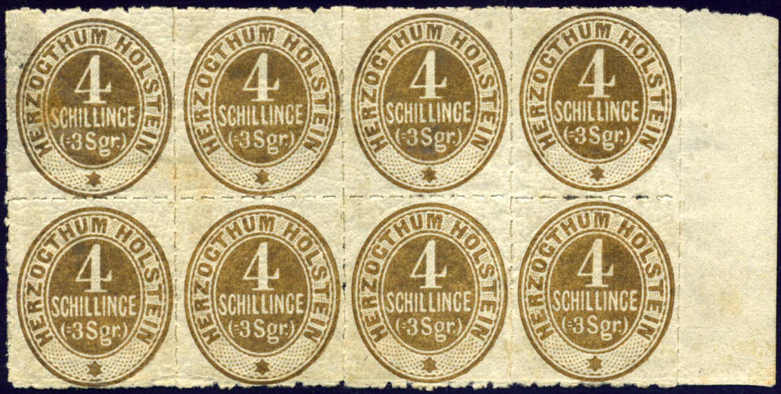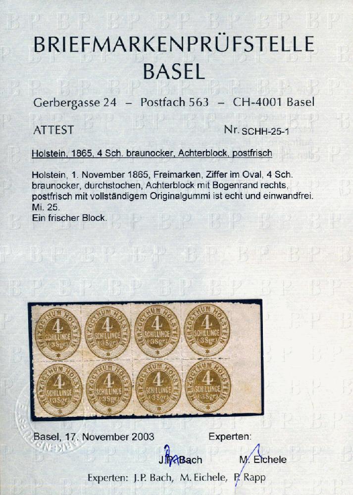 | Zusatzinformationen und Suchstichworte: | 75. AAK Phila GmbH Auktion 9. September 2022 Los 1533 (D) Altdeutschland Schleswig Holstein 4 S braunocker im waagr. 8er-Bl. v. re.Rand mit vollem Orig´gummi einwandfrei postfr., in der Mitte unten leicht angetrennt, somit 2 einwandfreie 4er-Bl. enthalten m. einwandfreiem Attest BPSB "ein frischer Block", imposantes Schaustück! Ausruf 400,00 EUR |