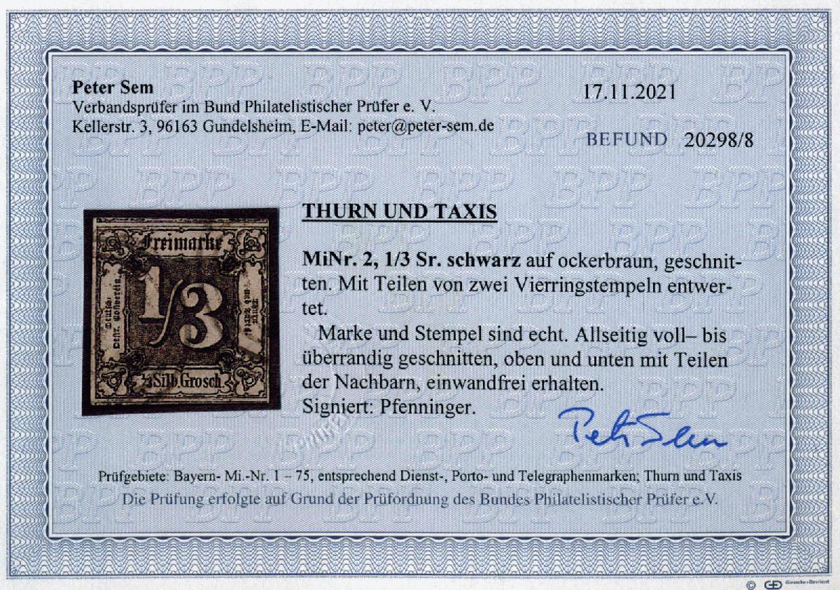 | Zusatzinformationen und Suchstichworte: | 75. AAK Phila GmbH Auktion 9. September 2022 Los 1538 Altdeutschland Thurn und Taxis 1/3 Sgr schwarz auf ockerbraun, rundgest. Luxus m. einwandfreiem FB Sem BPP (11/2021) "voll-überrandig, oben und unten m. Teilen der Nachbarn", Ausnahmestück! Ausruf 150,00 EUR |