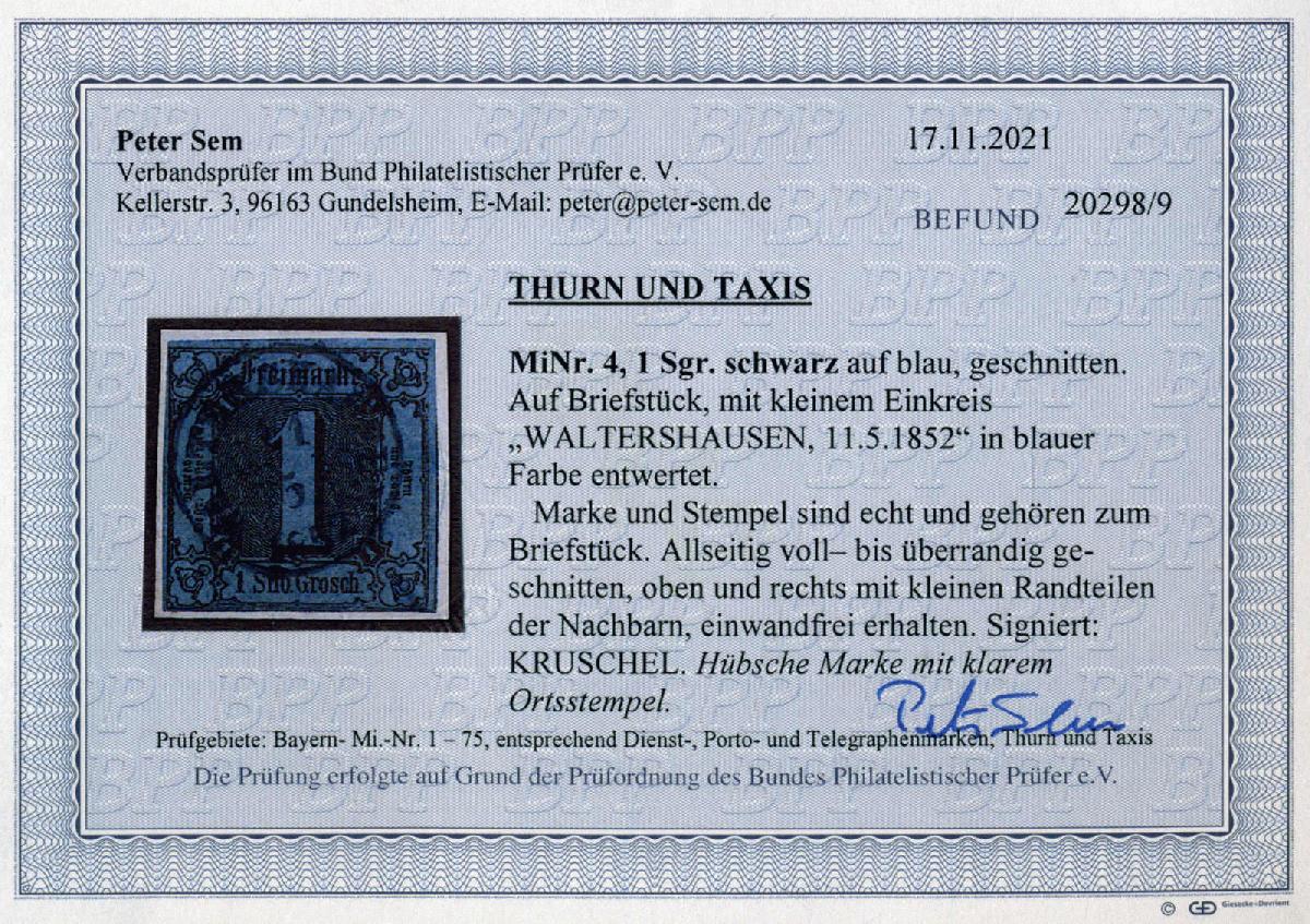 | Zusatzinformationen und Suchstichworte: | 75. AAK Phila GmbH Auktion 9. September 2022 Los 1539 Altdeutschland Thurn und Taxis 1 Sgr schwarz auf blau auf Luxus-Bfstck. m. kl. K1 WALTERSHAUSEN 11.5.1852 m. einwandfreiem FB Sem BPP (11/2021) "voll-überrandig m. kl. Randteilen der Nachbarmarken", Ausnahmestück! Zuschlag 80,00 EUR |